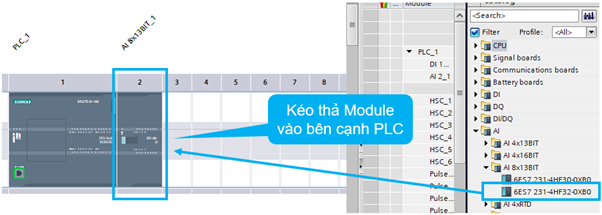 Bước 3: Vào phần mềm tia portal ở phần cứng PLC, kéo thả module analog vào phía bên phải của PLC