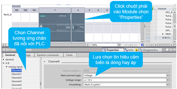 Bước 4: Cấu hình chân 0 của module analog là chân đọc tín hiệu analog về, ở trường hợp này chân này cấu hình dạng điện áp 0-10V (Nếu bạn dùng cảm biến analog 4-20mA thì chọn mục này là current-dòng điện)