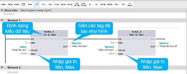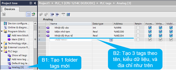 Bước 6: Vào mục tag của PLC tạo 3 tag, tag IW70 là địa chỉ input của module analog, tag MD200 là tag trung gian, tag MD204 là tag đọc về giá trị analog thực tế, ở đây định nghĩa chân analog này đọc nhiệt độ